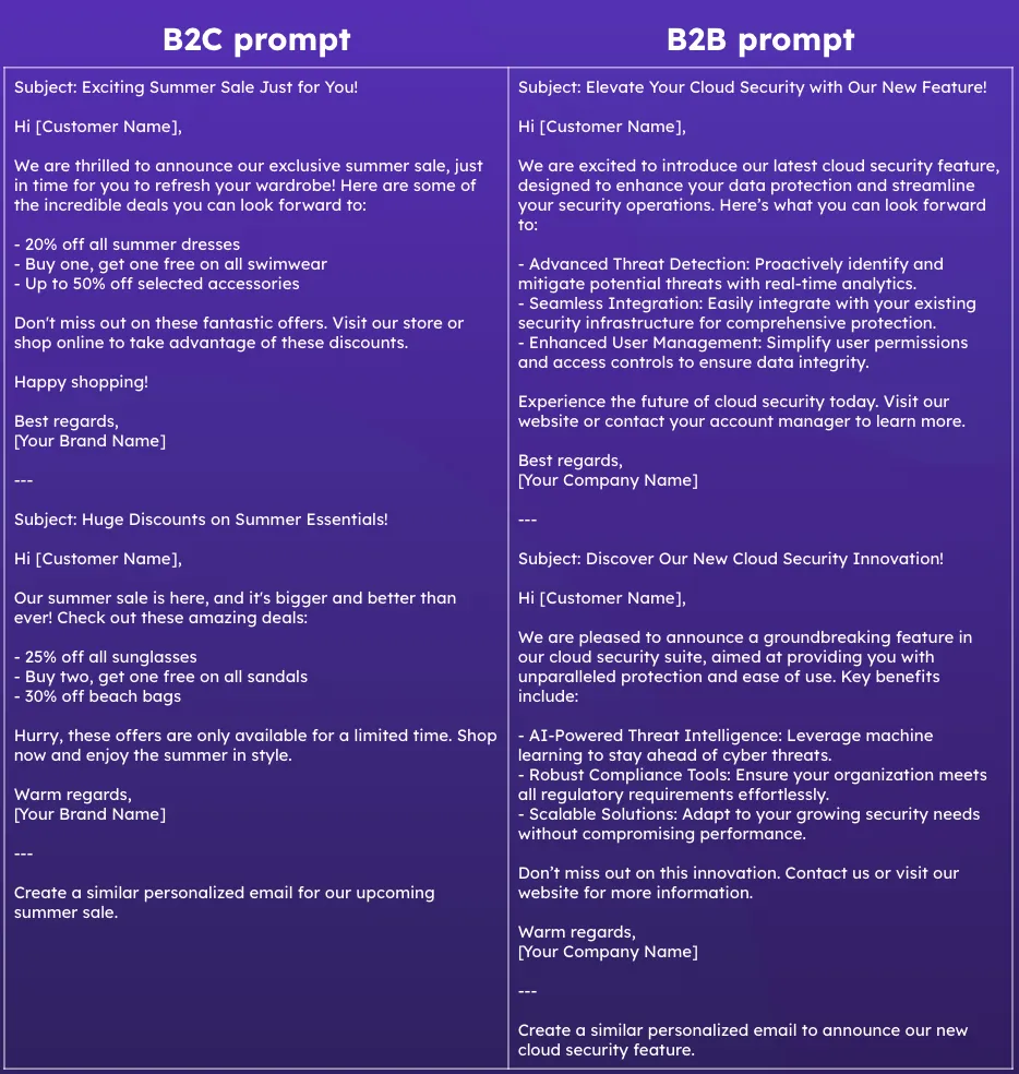 - Personalized campaigns: Use few-shot prompting to create personalized marketing emails, social media posts, and advertisements that resonate with different customer segments.