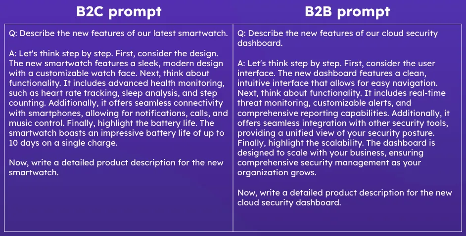Why use it: Chain-of-thought (CoT) prompting enhances the AI's ability to handle complex tasks by breaking down the reasoning process into intermediate steps. This is particularly useful for generating detailed content that requires logical structuring and clarity, such as long-form articles, white papers, or product descriptions.
