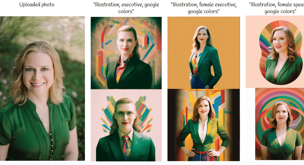 I first had to upload a current photograph so we had a basis for the new headshot. I then played with the prompts to get a style I liked. I started with prompts focusing on a) the colors (red, blue, green, and yellow); and b) the style (look like an illustration). It was all pretty intuitive and ultimately a prompt of “illustration, Google colors” worked well. Yes, it was that simple of a prompt.