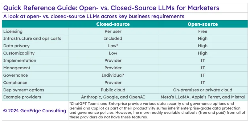 Cost-efficiency vs. implementation complexity: While open-source models are free, like a puppy is free, their deployment requires significant technical know-how and resources, which may negate some cost savings. Collaboration between marketing and technical teams is crucial to evaluate feasibility and maximize the models' effectiveness.