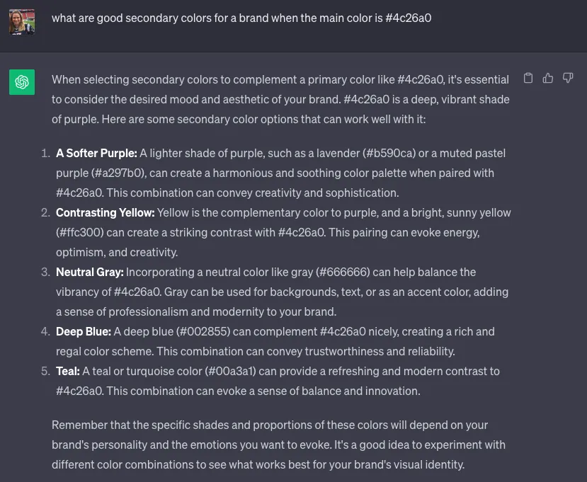 Once ChatGPT gave me a list of names, I told it the names I liked and followed up with prompts such as "Can you riff on [name1, name2, etc.] and create names that include the benefits of AI or clever AI-related wordplay?" I eventually landed on the name "GenEdge." Confirming the domain's availability sealed my decision.