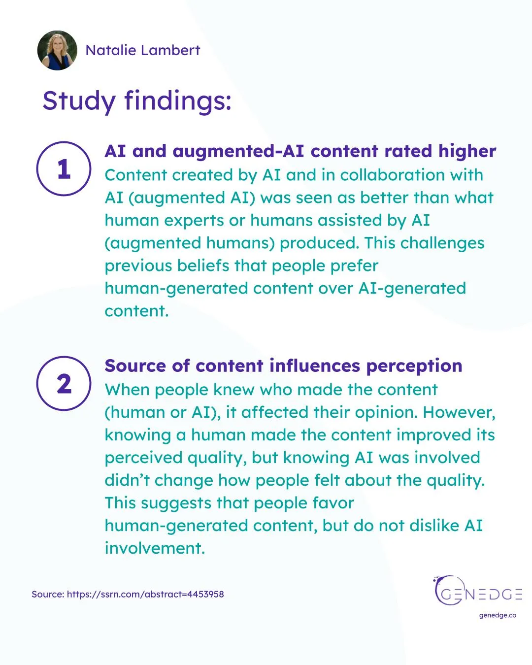 AI and augmented-AI content rated higher. Content created by AI and in collaboration with AI (augmented AI) was seen as better than what human experts or humans assisted by AI (augmented humans) produced. This challenges previous beliefs that people prefer human-generated content over AI-generated content.