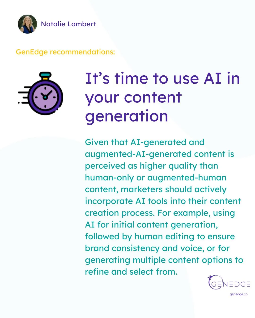 It's time to use AI in your content generation. Given that AI-generated and augmented-AI-generated content is perceived as higher quality than human-only or augmented-human content, marketers should actively incorporate AI tools into their content creation process. For example, using AI for initial content generation, followed by human editing to ensure brand consistency and voice, or for generating multiple content options to refine and select from.