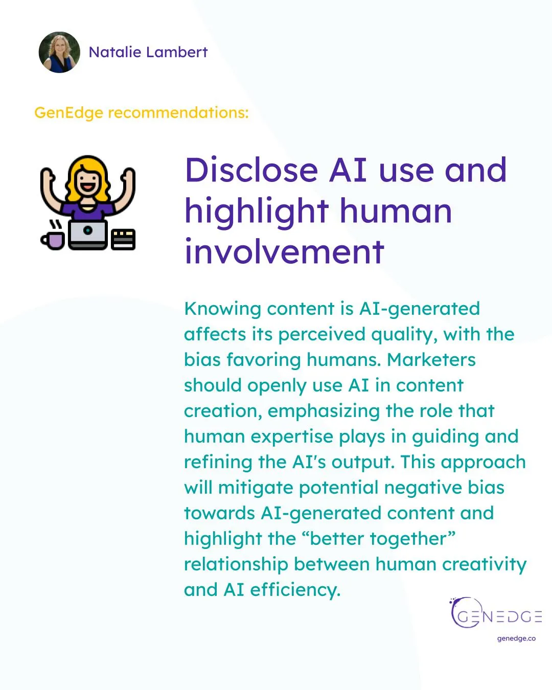 Disclose AI use and highlight human involvement. Knowing content is AI-generated affects its perceived quality, with the bias favoring humans. Marketers should openly use AI in content creation, emphasizing the role that human expertise plays in guiding and refining the AI's output. This approach will mitigate potential negative bias towards AI-generated content and highlight the "better together" relationship between human creativity and AI efficiency.