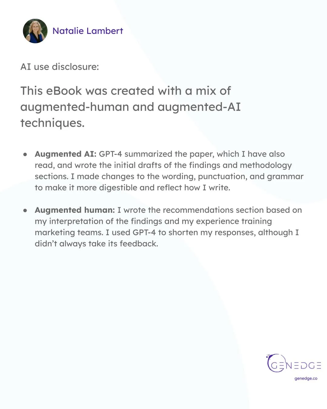Augmented human: I wrote the recommendations section based on my interpretation of the findings and my experience training marketing teams. I used GPT-4 to shorten my responses, although I didn't always take its feedback.